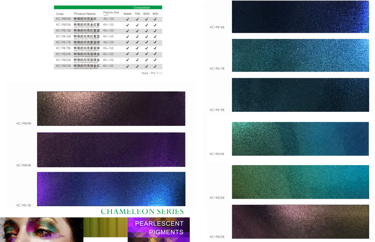该系列珠光颜料具有卓越的变色效果,多样的色彩变化,色浓度表现优异,光泽度优于市场同类产品。