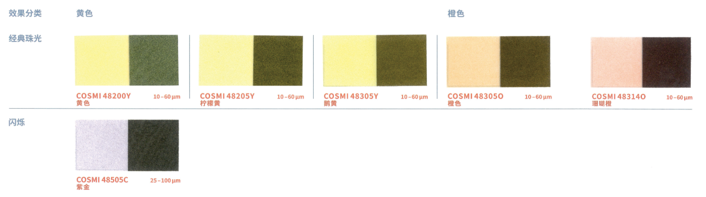 从含蓄的微光到剧烈的闪光效果,多样的金色色调具有极其精美和深邃的金属光泽。这一系列精致的金色珠光颜料拥有极高的色彩纯度、良好的遮盖力和奢华的闪光,为化妆粉或眼影增添了自然的光泽。该系列珠光颜料重金属含量低,肤感舒适,妆感光滑且均匀。